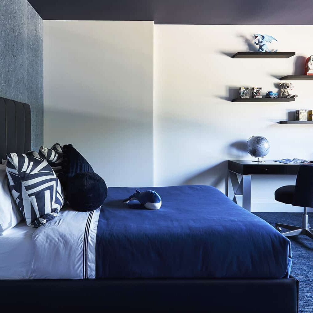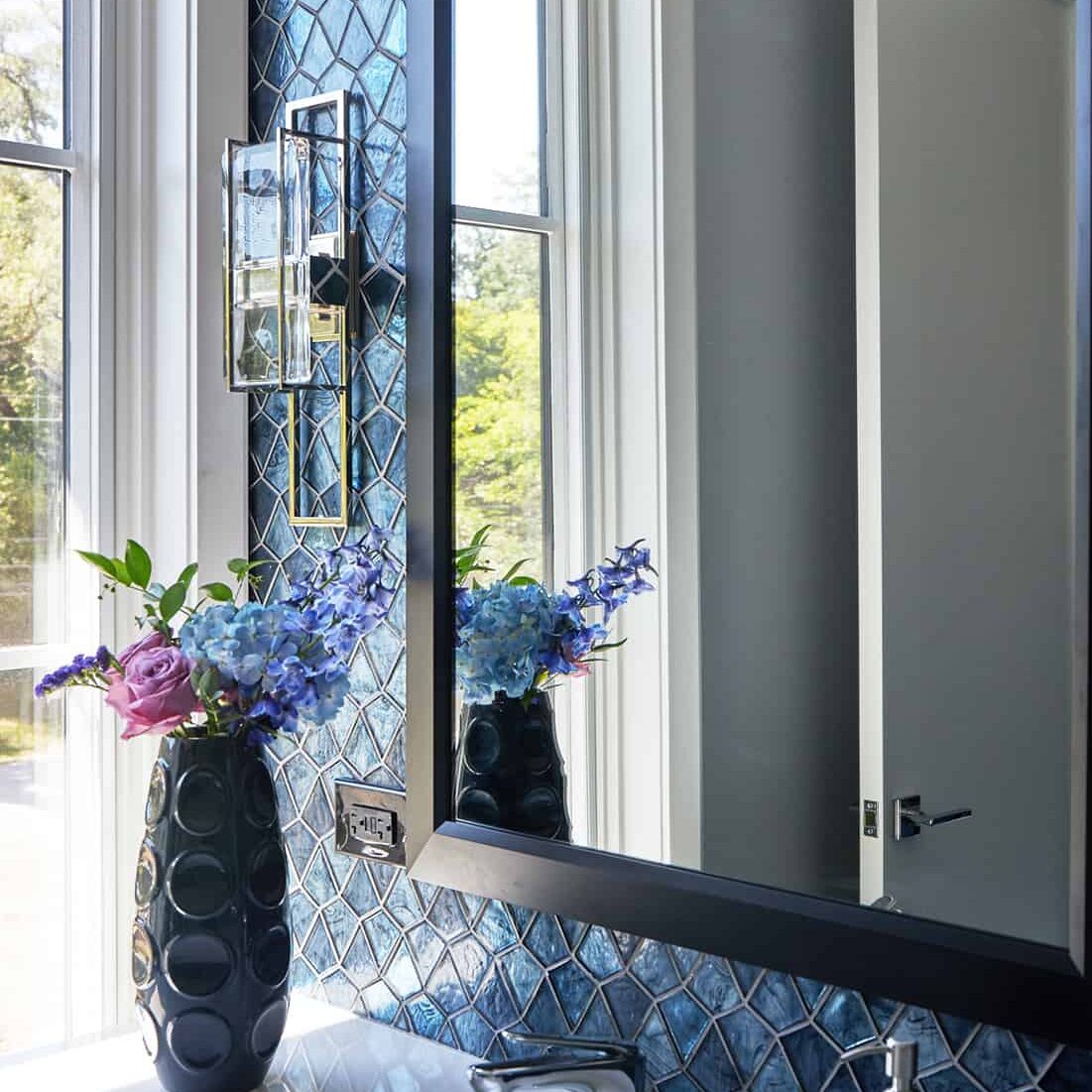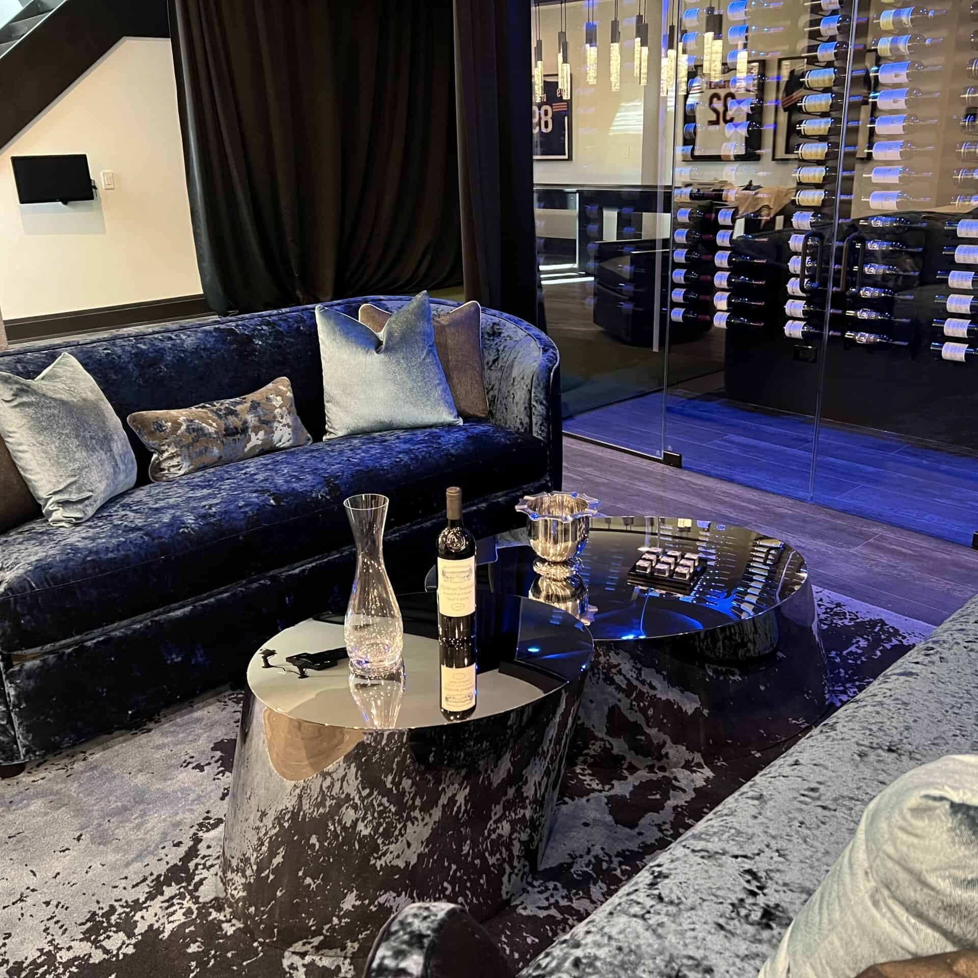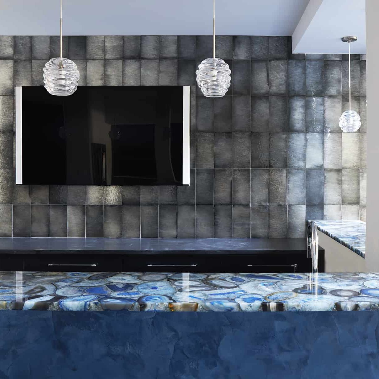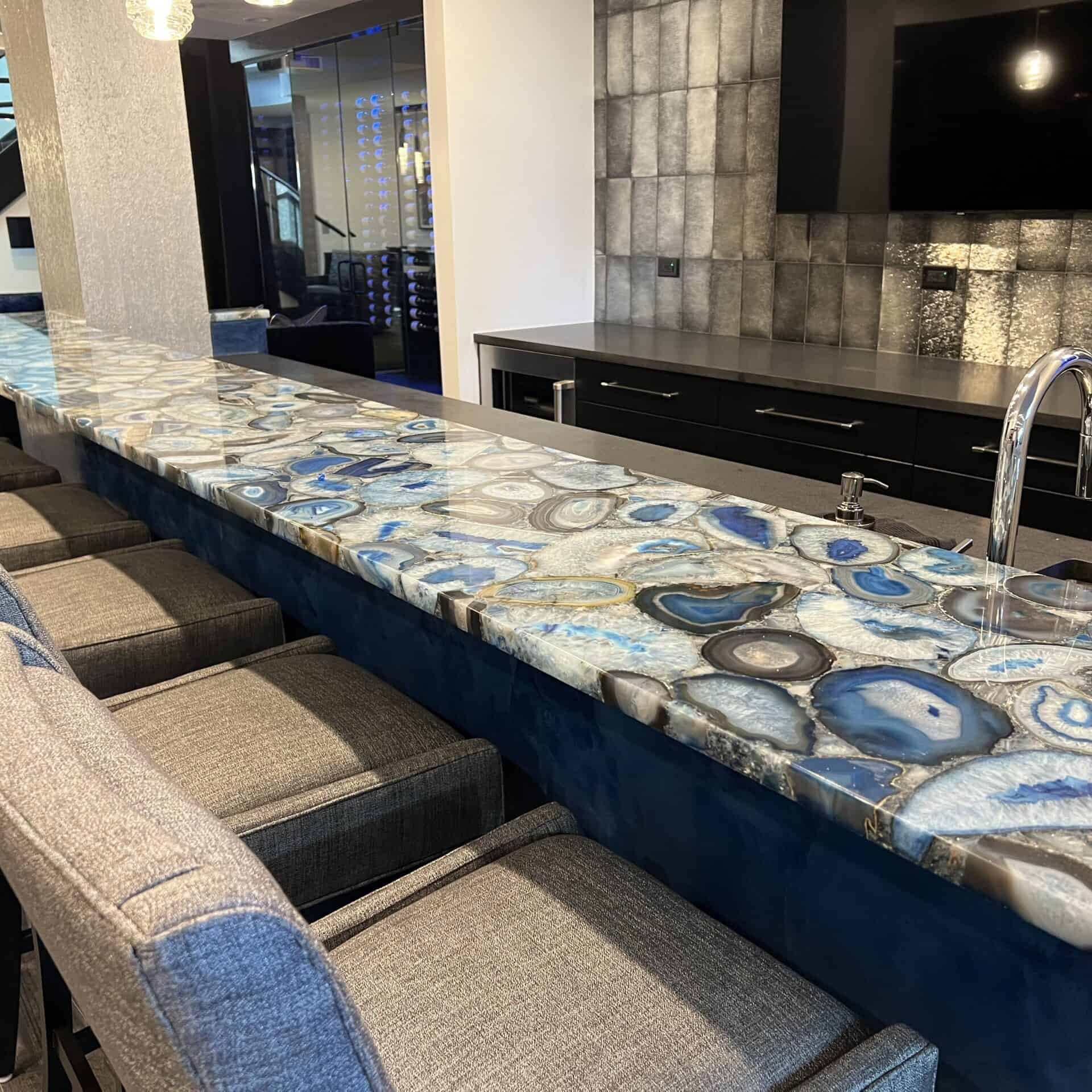 - Basement fireplace: blue agate polished precious stone and Soelberg elevate Oceano