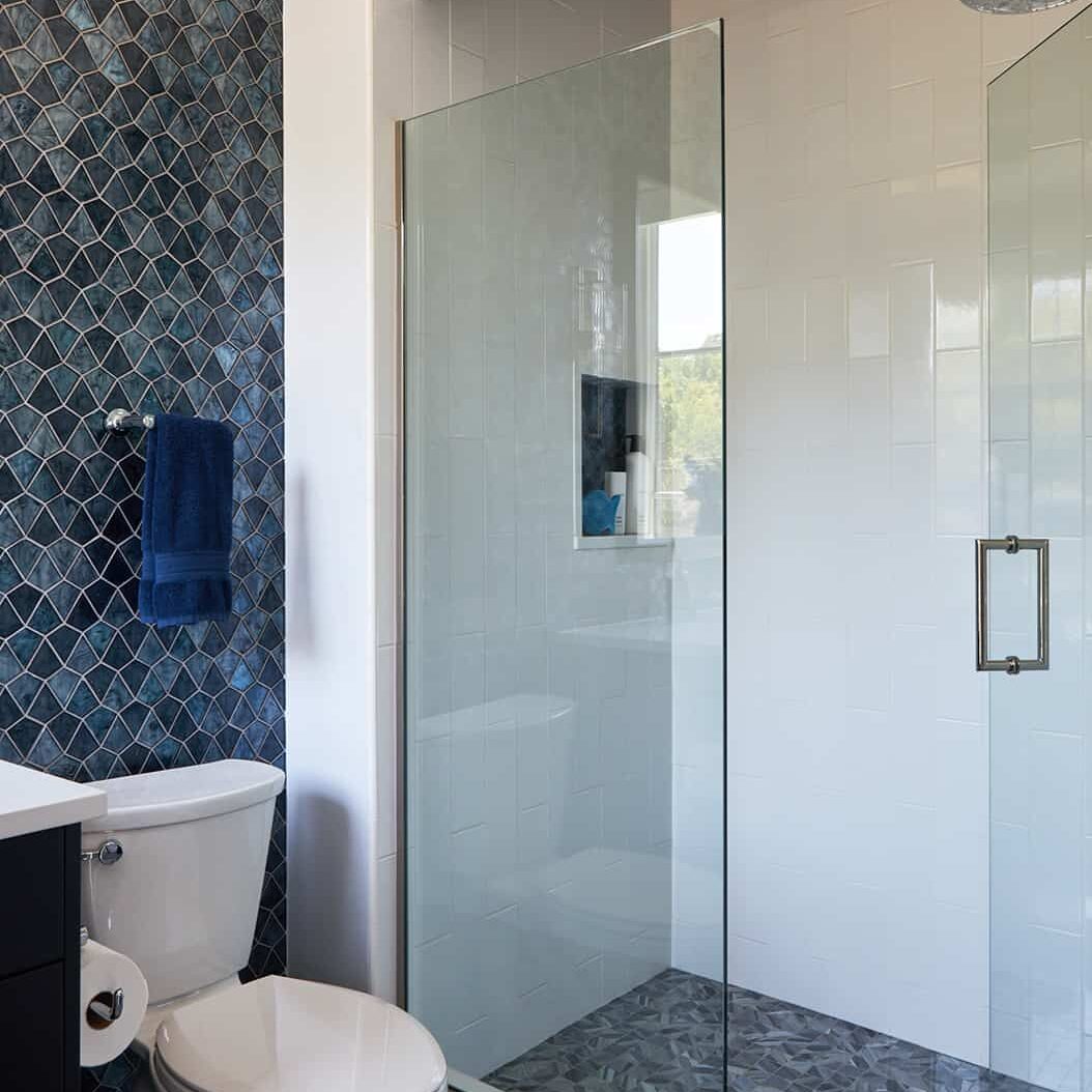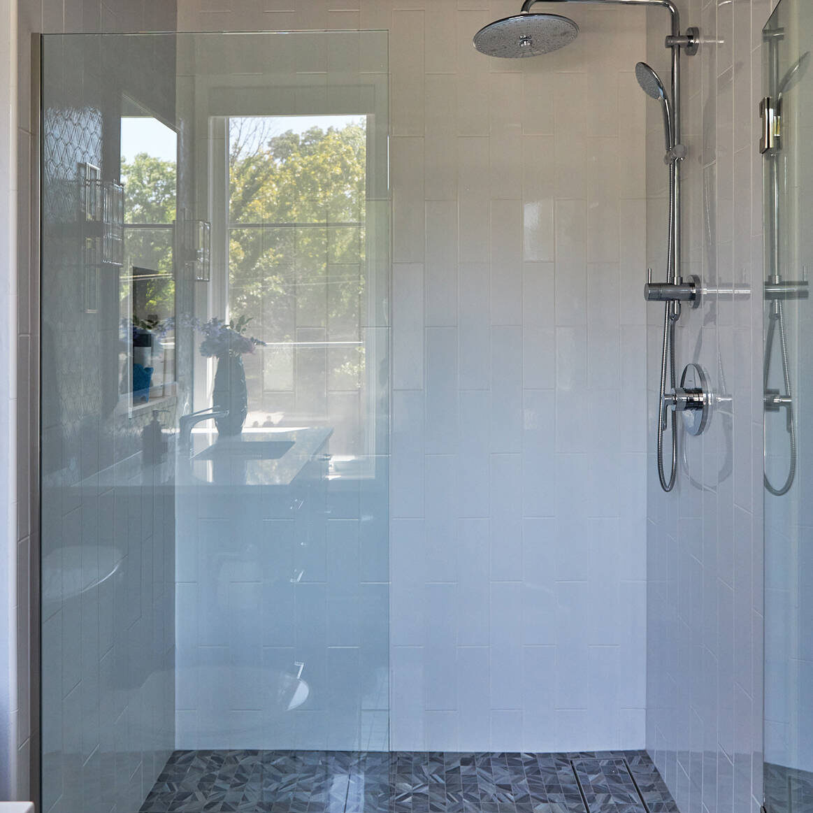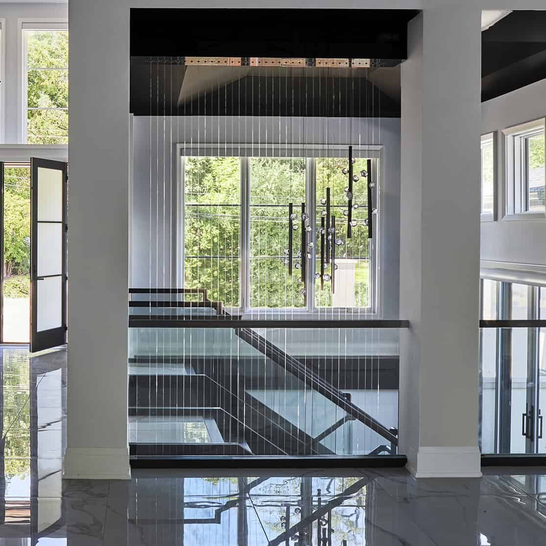 - Main stair: 4″ white oak treads with 1/2″ tempered glass balustrade
